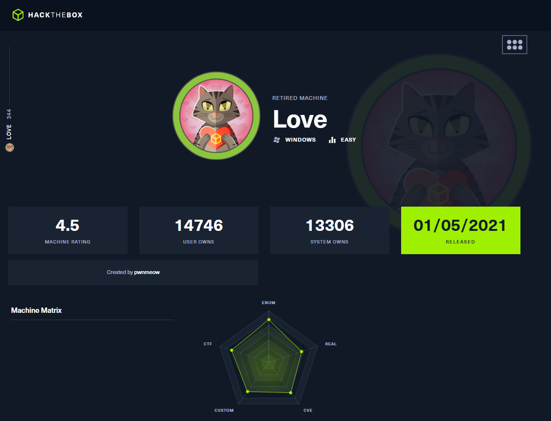 It’s time to test my skills again on a Windows machine, in this case the Hack The Box Love box. It’s an easy machine, great for learning how to enumerate and use an automated script to find possible vectors to exploit vulnerabilities and take over the machine, here I go.