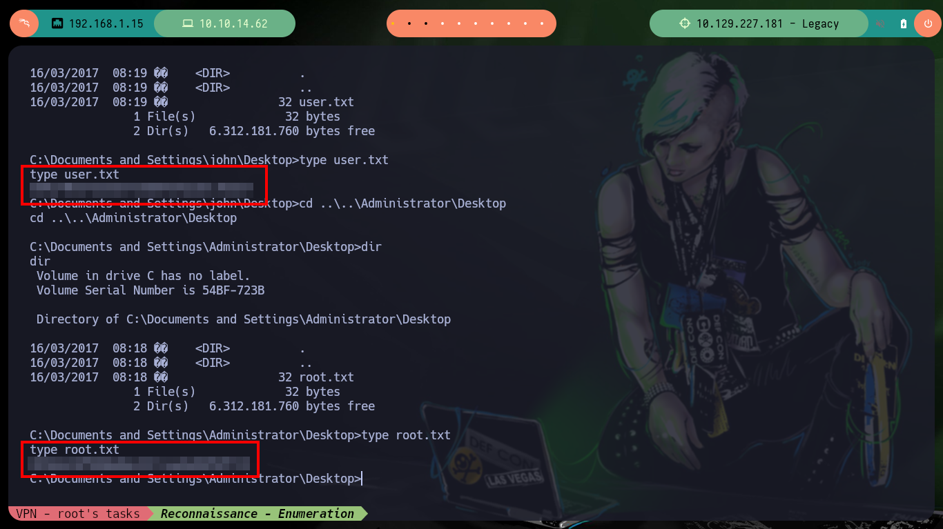 I remember that the SMB protocol version was also vulnerable to the MS08-067 exploit, so I also search on Github and find a project by andyacer, the ms08_067 exploit that might allow me to find another way to compromise the target machine. I just follow the steps they tell me, create a shellcode with msfvenom, modify the script and run it correctly, again I get access to the box. I still have the problem when executing the whoami command, but I can now access the user flags required by Hack The Box to prove the compromise of the box.