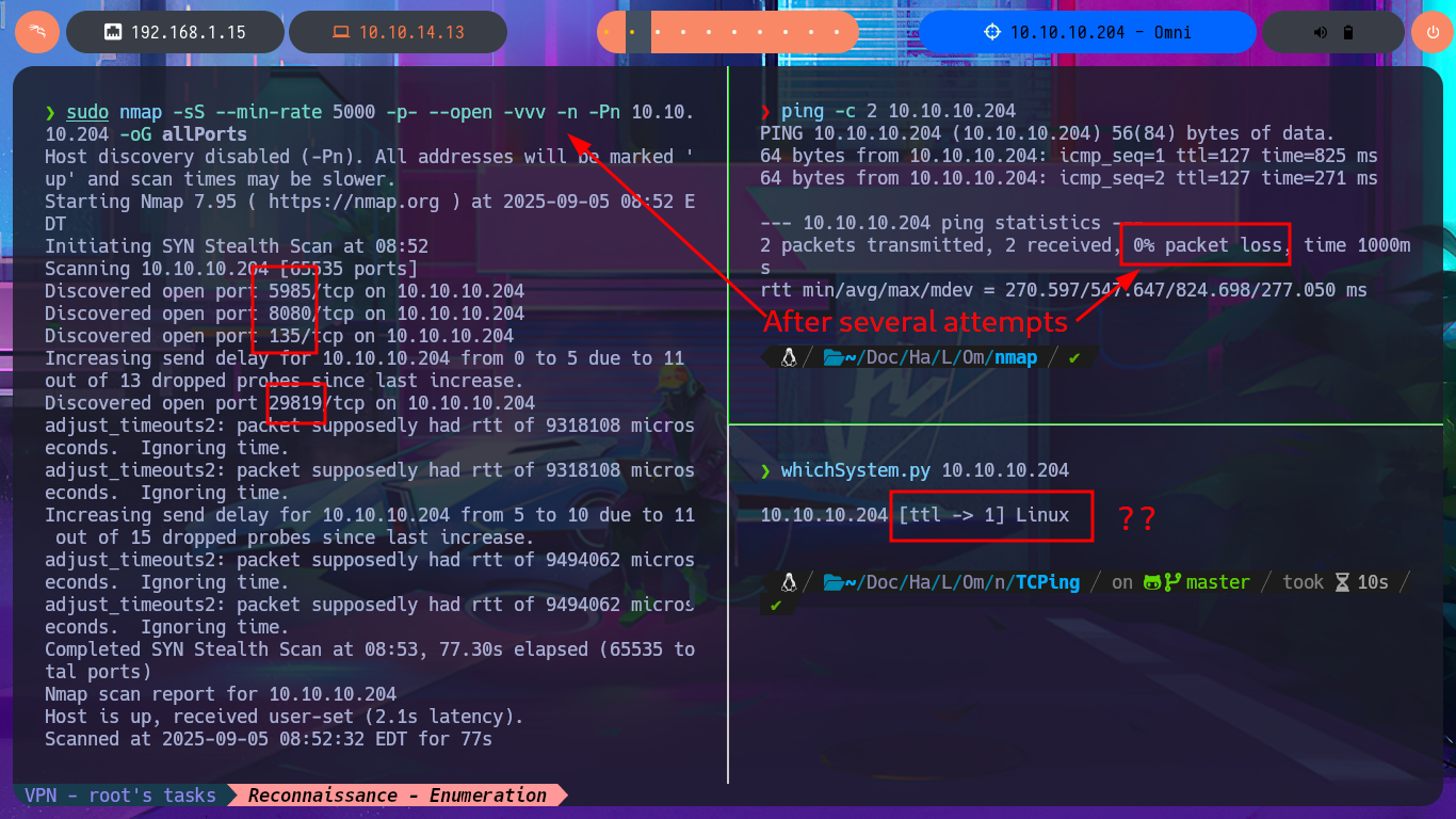 I start the Reconnaissance phase again, following my methodology, which I refine with each lab I do, but first I check if I can already interact with the machine through the Hack The Box’s VPN. To do this, I use ping, and after several failed attempts, I manage to send a trace. The next thing I do is verify the box’s OS with the whichSystem.py tool, developed by hack4u’s, which takes into account the TTL value to deduce it (although I still have connection problems on this machine). I can now list the open ports with nmap and leak information about the services available on each of them, taking advantage of the scripts of this beautiful tool. I find a lot of interesting information, but before continuing and taking into account the problems I had with ping and whichSystem.py, I take the opportunity to use other tools such as fastTCPScan and TCPing to perform port enumeration.