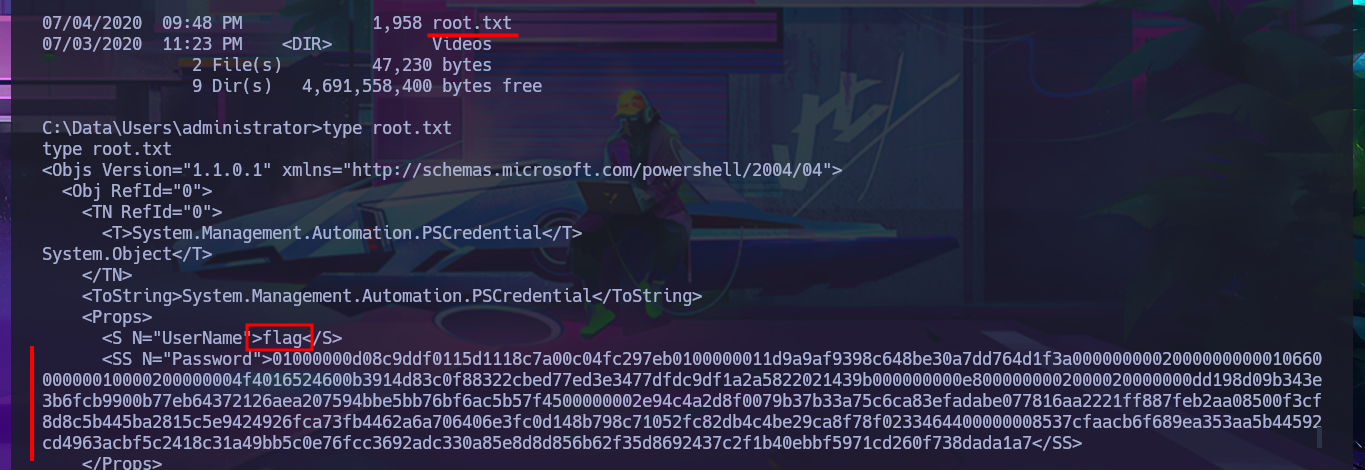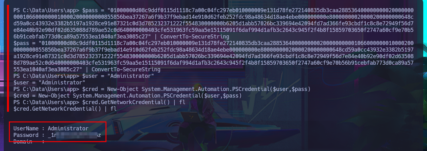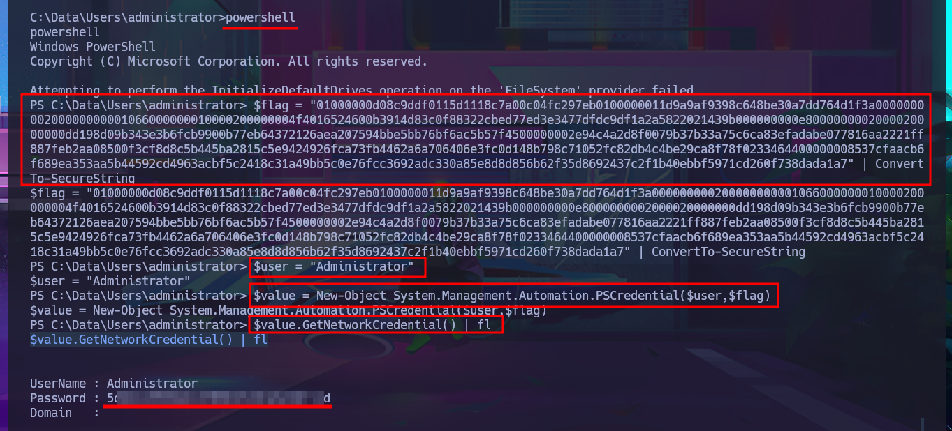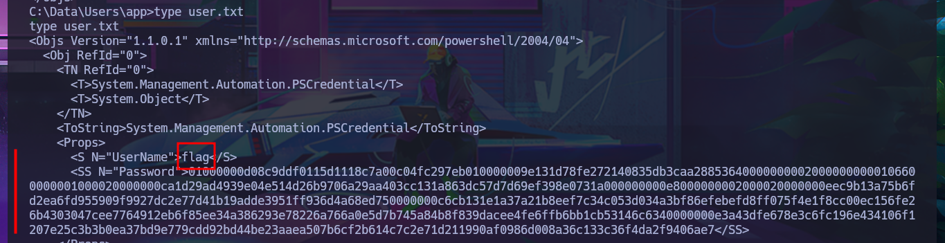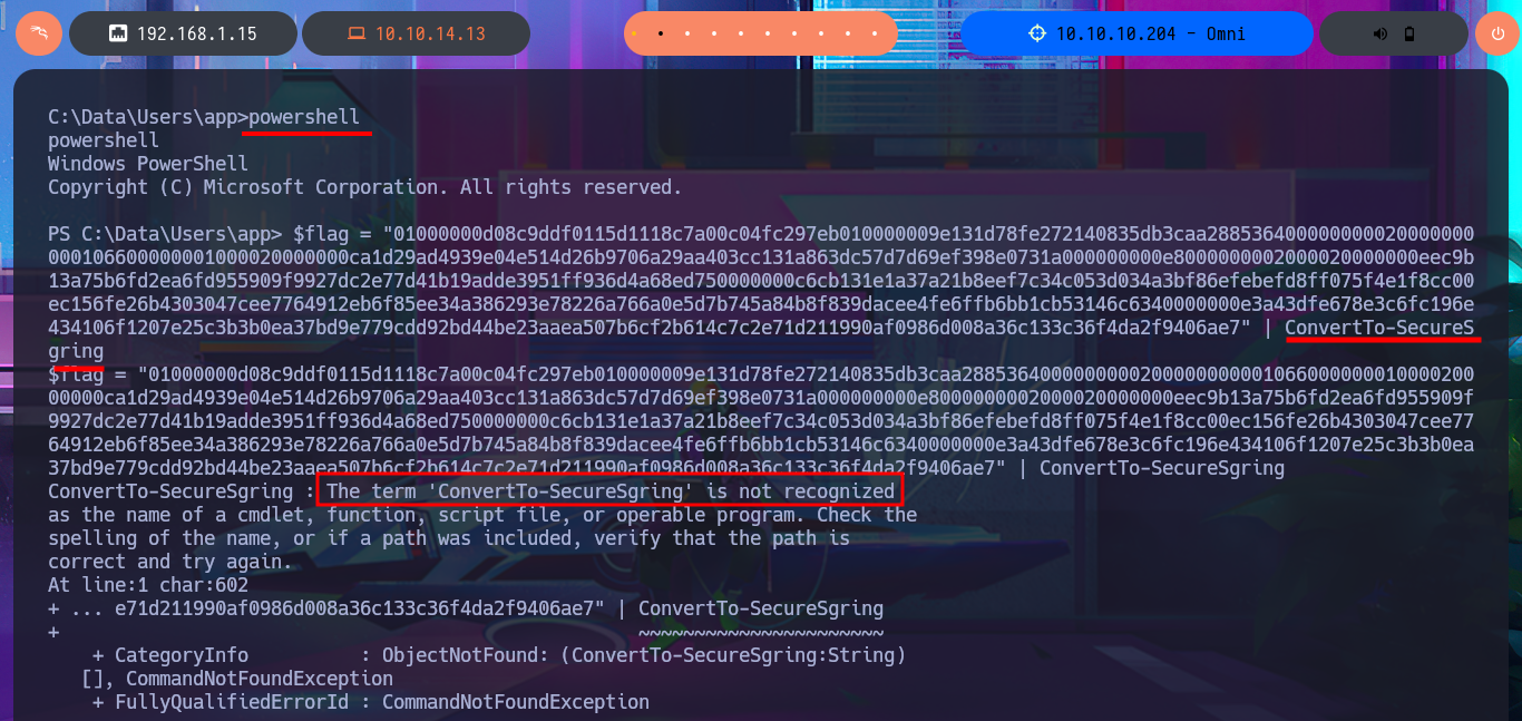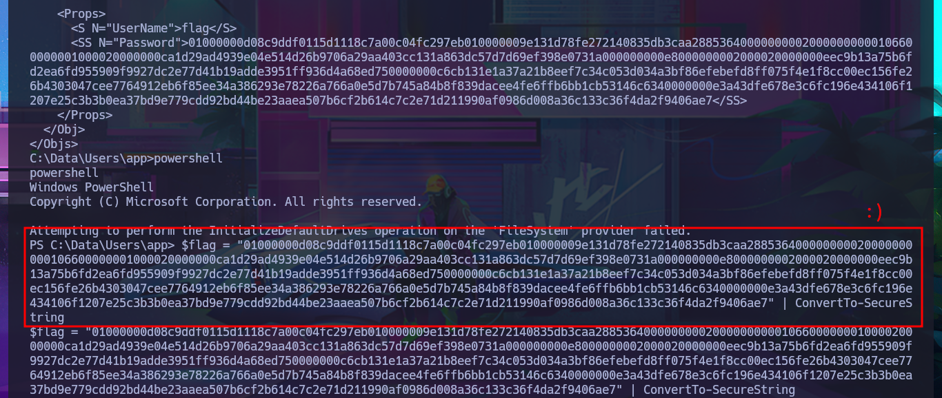 After trying hard to list the system, I begin to find very varied and interesting information, such as an additional volume that may be a locally mounted file system, and .txt and .xml files that appear to be related to the WDP web server. Unfortunately, I cannot access the content of any of the files I found, nor that of the first flag, as the .NET PSCredential class is being used to protect the content (using Secure String). I try to obtain the content in plain text, but I do not have the necessary module to do so, so I must look for another attack vector.