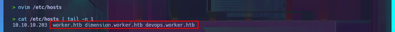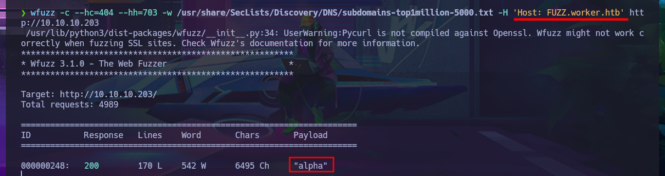 wfuzz -c --hc=404 --hh=703 -w /usr/share/SecLists/Discovery/DNS/subdomains-top1million-5000.txt -H 'Host: FUZZ.worker.htb' http://10.10.10.203