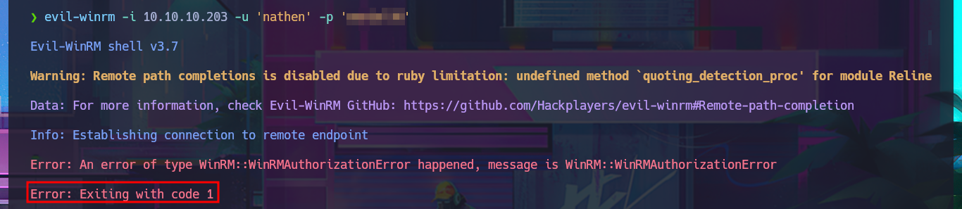 evil-winrm -i 10.10.10.203 -u 'nathen' -p 'w...8'