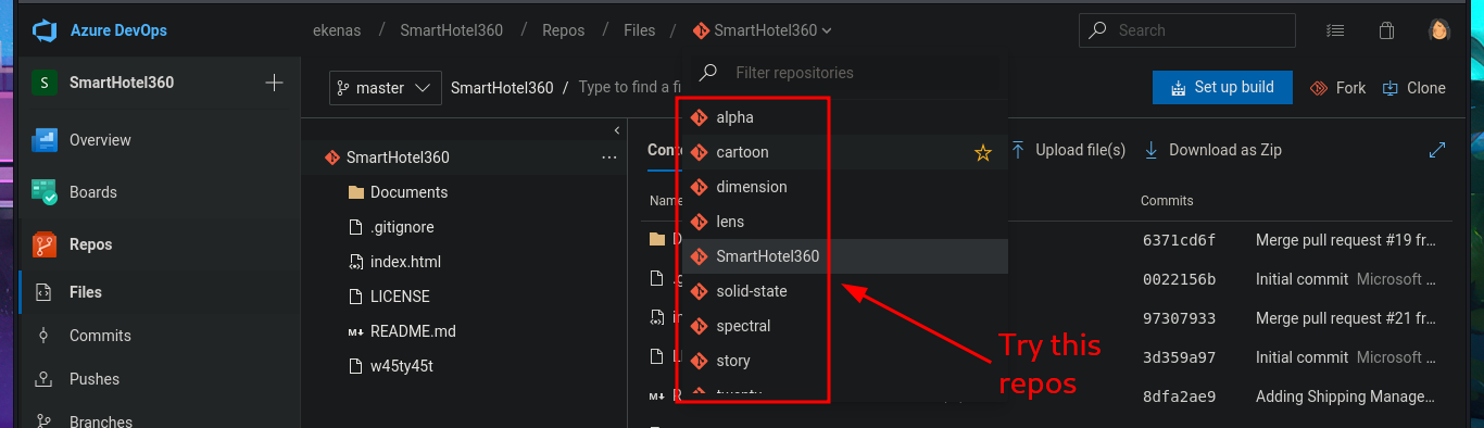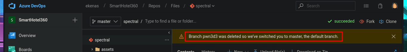 Fortunately, the credentials I found with svn allow me to authenticate on the devops server and access the Azure DevOps cloud-based platform, but before continuing, I try to reuse the password to access with evil-winrm through the WinRM protocol, but without success. I also find other subdomains with wfuzz. On the platform, I find the version of this technology, but with searchsploit there are no exploits available for this technology, so I return to my browser and access the resources of the SmartHotel360 object.