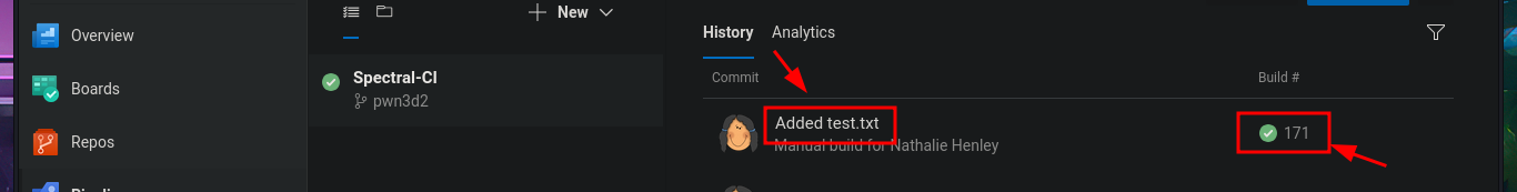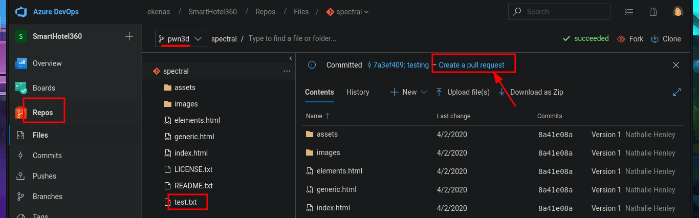 In the new branch, I managed to upload the file. Now I just have to create the pull request and set auto-complete so that all the changes will be merged into the master branch (spectral). The last step is to add the job to the queue with Queue pipelines and wait just a few seconds to access the file I just uploaded to the main path of the website I managed to modify.