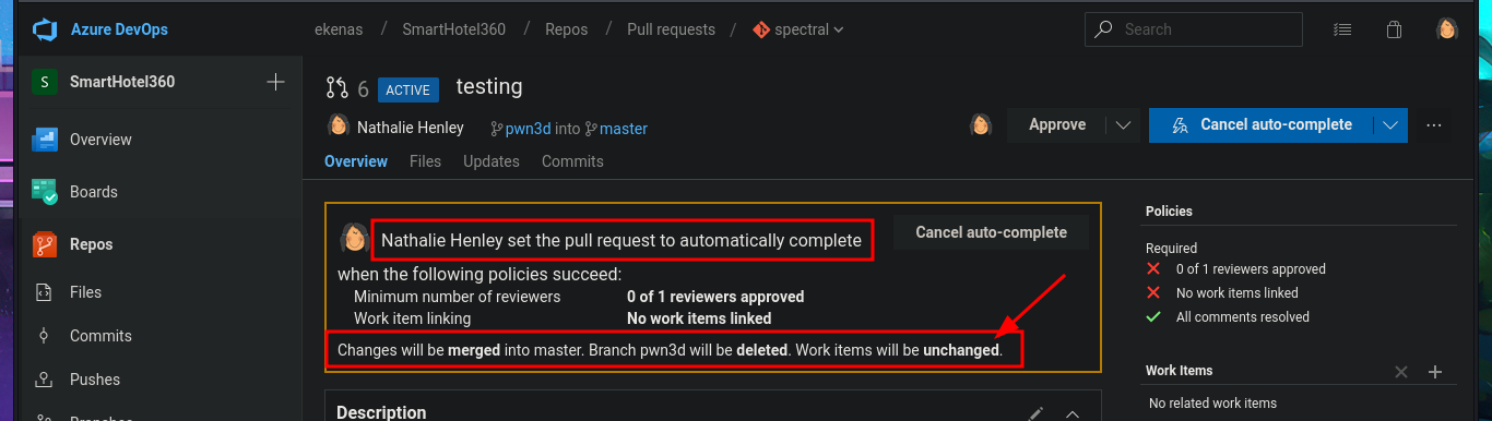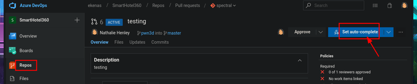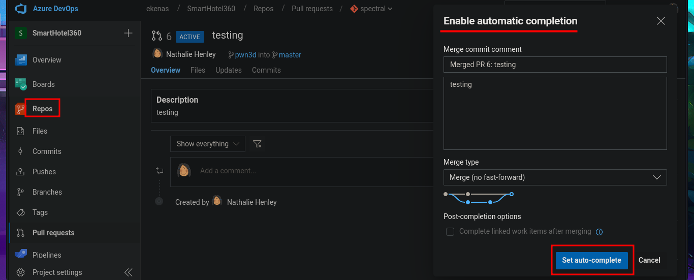 # Create a pull request --> New Pull Request --> Create --> Set auto-complete --> Set auto-complete