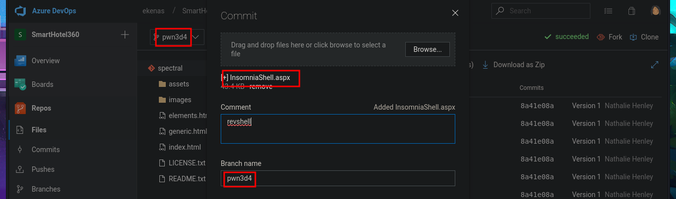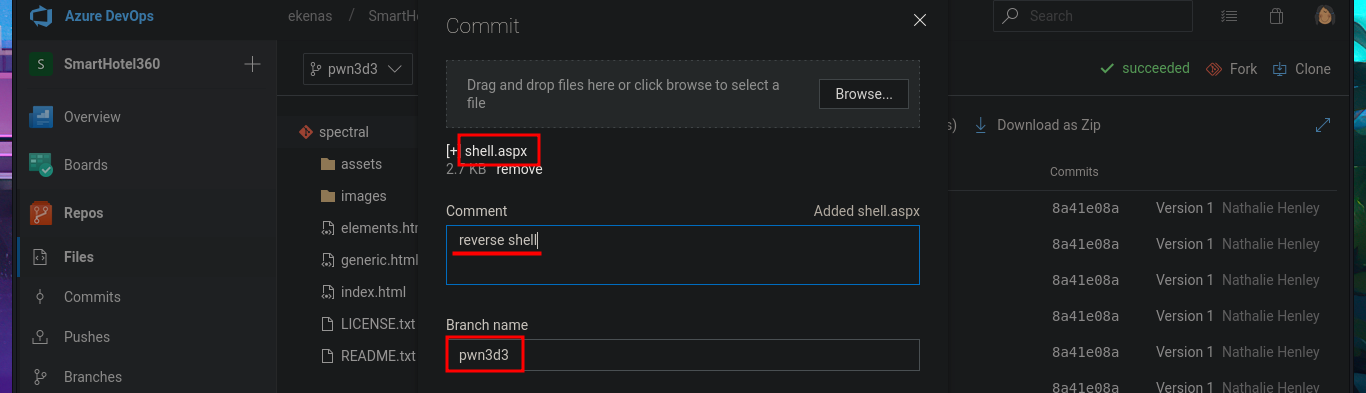 I think I’ve found my attack vector, so I’m going to try to upload a malicious file to one of the web applications that sends a Reverse shell to my attacking machine. Since I’m interacting with an IIS server, the file will most likely have to be an interpreted .asp or .aspx script, so I’m going to try the latter, which is the more modern one. With msfvenom, I generate the malicious file and follow the steps I took previously: choose a repository to create a new branch where to upload the file, set the push request, add the job to the queue, and after a short time it is accessible from my browser, but I can’t get it to run correctly. However, in the field of pentesting, you have to be persistent, as there are many excellent resources available, such as Darknet’s reverse shell. After uploading it and repeating all the previous steps again, I manage to catch the incoming Reverse shell with nc on port 443, which I opened beforehand.