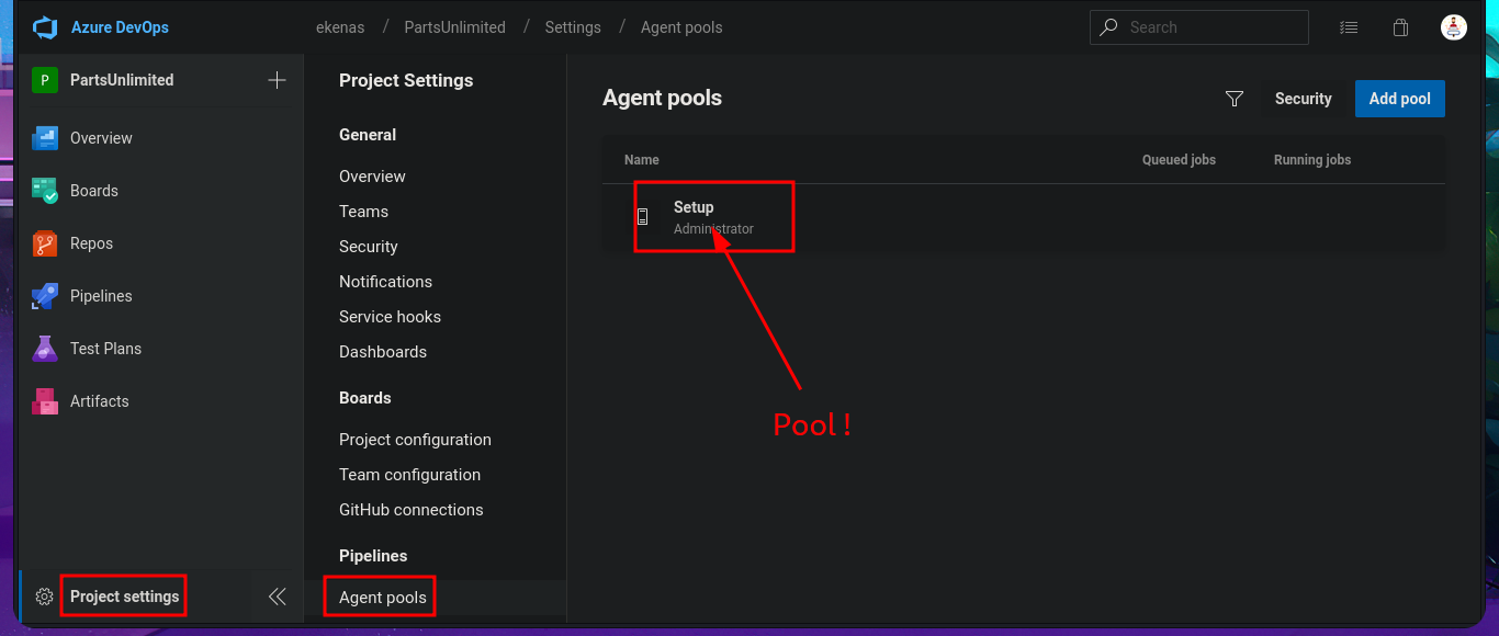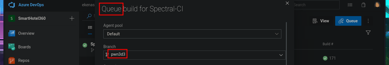 Once I was able to access the Azure DevOps platform again, I found some very important information in the Project settings panel that might allow me to Escalate privileges, since the user robisl belongs to the Azure Build Administrators group, which has the ability to create new pipelines. The steps that would allow me to execute code on the victim machine are not very complex. I just need to create a pipeline from an Azure Repos Git, with the minimum requirements, and in the final YAML file, more precisely in the script attribute, I can inject the command I want. Once all the changes have been saved in a new branch (since I don’t have permission to push to the master branch), I’m informed on screen that the Default pool cannot be found, so I will have to investigate this error in order to resume the attack.