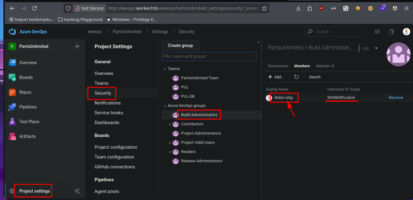 # Project settings --> Security --> Build Administrators --> Robin Islip [WORKER\robisl]