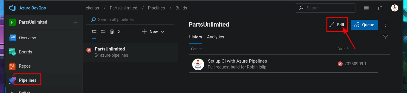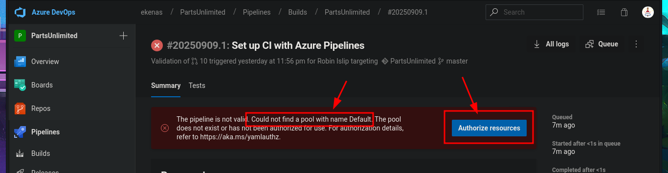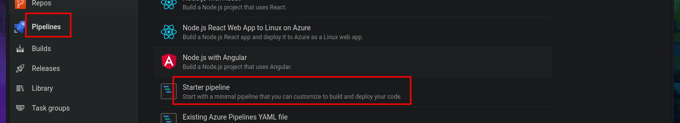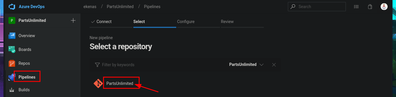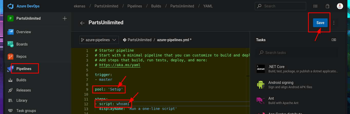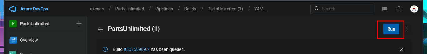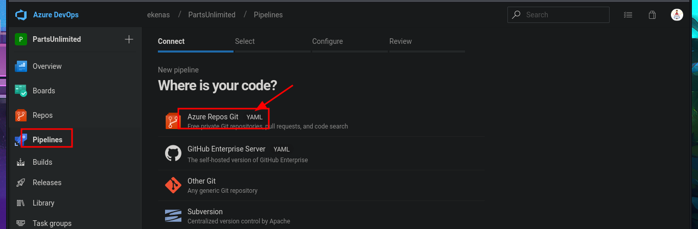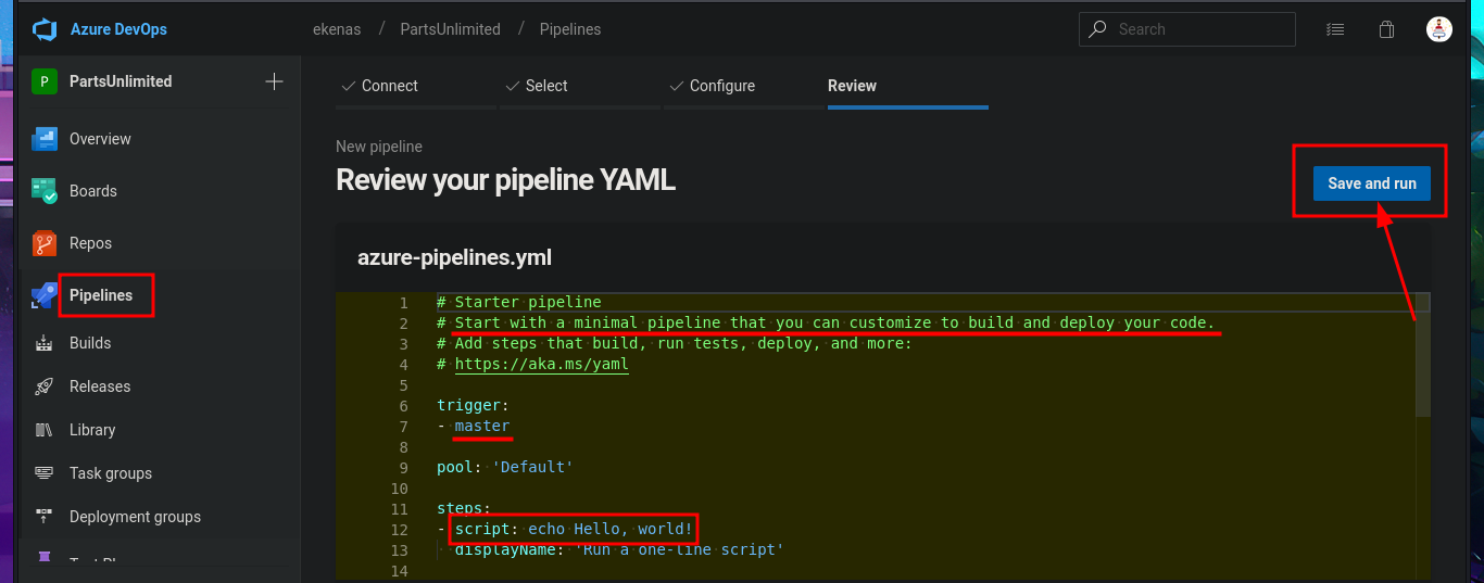 # Pipelines --> New pipeline --> Azure Repos Git --> PartsUnlimited --> Starter pipeline --> Review your pipeline YAML