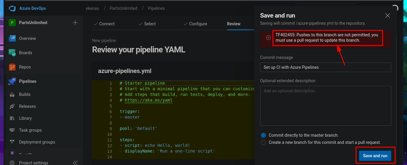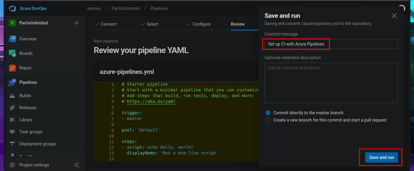# Save and run --> Set up CI with Azure Pipelines --> Save and run
