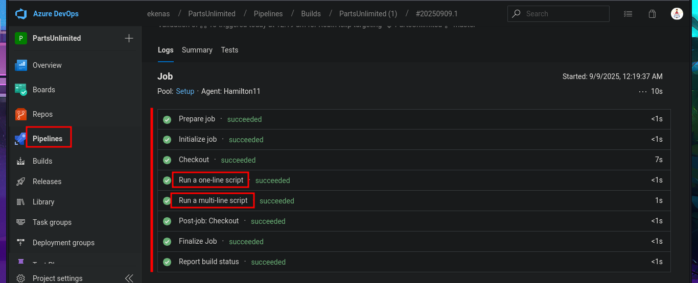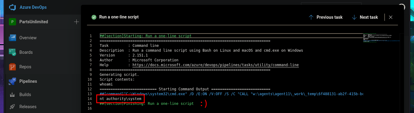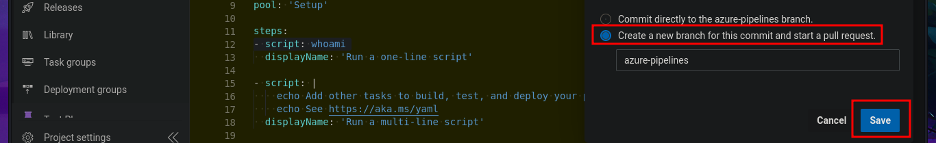 I return to the Project Settings section and find the Setup pool available in the Agent Pools tab. So, by simply editing the pipeline I had previously created and modifying the pool attribute, I perform an initial command execution test. I save the changes in a new branch and see that there are no errors in the job logs. If I open the log related to the Run a one-line script, I see the output of the whoami command that I had set in the pipeline script attribute. Now, my last goal is to get a Reverse shell.