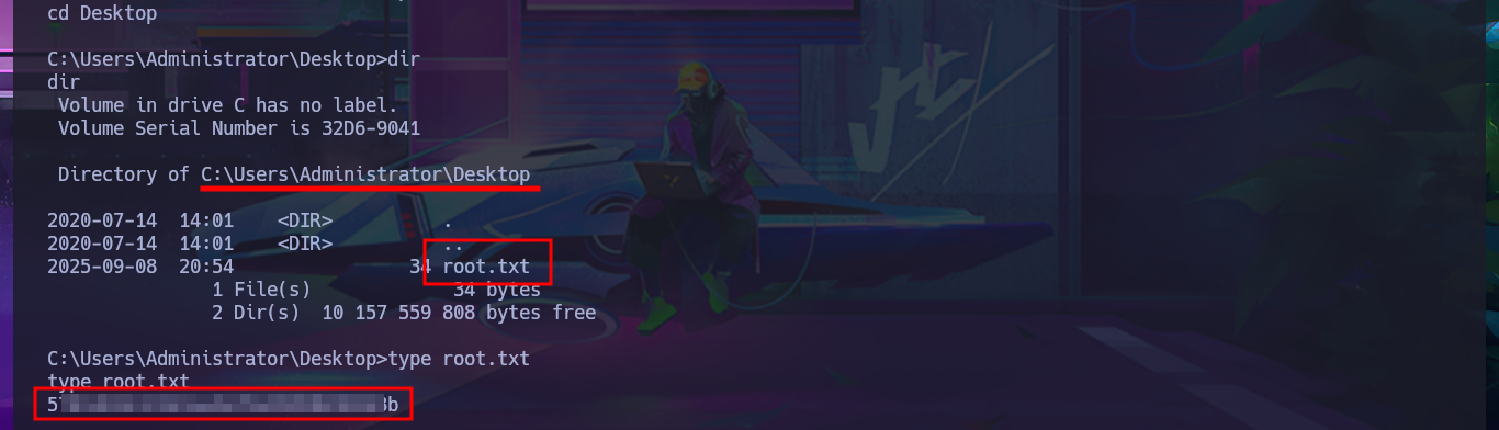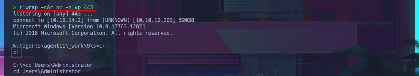 To obtain a Reverse Shell, I just need to transfer nc.exe to the victim machine using the session opened with evil-winrm. The next thing I do is edit the pipeline I created again, but this time I’m going to set the script attribute with a one-liner that sends the Reverse Shell using nc.exe. Finally, I save the changes and run them. This way, I succeed in catching the incoming Reverse Shell with nc on port 443 of my attacking machine. Now I have a new session, but I’m in the Azure DevOps volume (w), so I must switch to c and I can now access the last flag to successfully complete this exciting Hack The Box lab.
